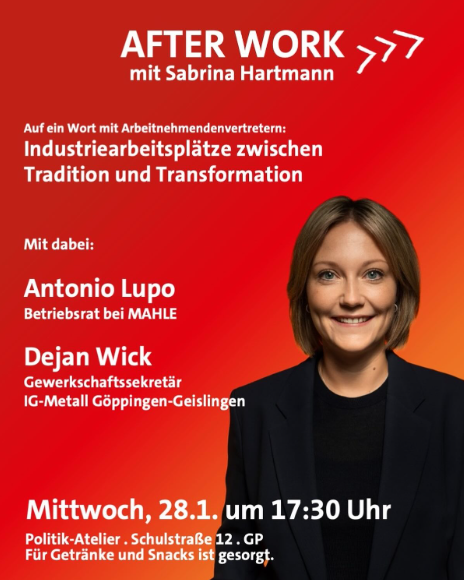 Die SPD-Kreisvorsitzende und Landtagskandidatin Sabrina Hartmann lädt am Mittwoch, den 28. Januar 2026, zum After-Work-Gespräch „Auf ein Wort mit Arbeitnehmervertretern: Industriearbeitsplätze zwischen Tradition und Transformation“ ein. Die Veranstaltung findet ab 17:30 Uhr im Politik-Atelier in der Schulstraße 12 in Göppingen statt.
